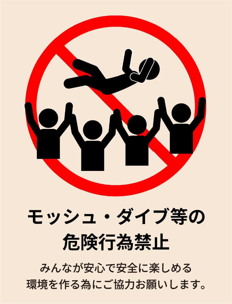 - 1Fスタンディングエリアの方は会場内での荷物や飲食物を置いての場所取り、座り込みはおやめください。